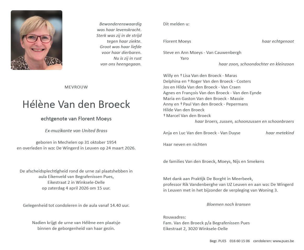 Van den Broeck Hélène 1954-2026 te Leuven (Echtg. Moeys Florent) op 24 maart 2026